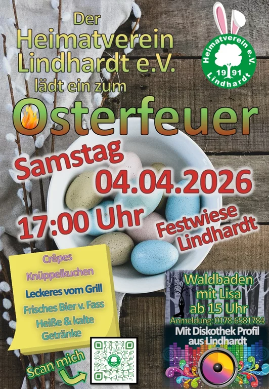 Am 04. April findest ab 17 Uhr unser tarditionelles Osterfeuer auf der Festwiese statt. Wir freuen uns auf euch.